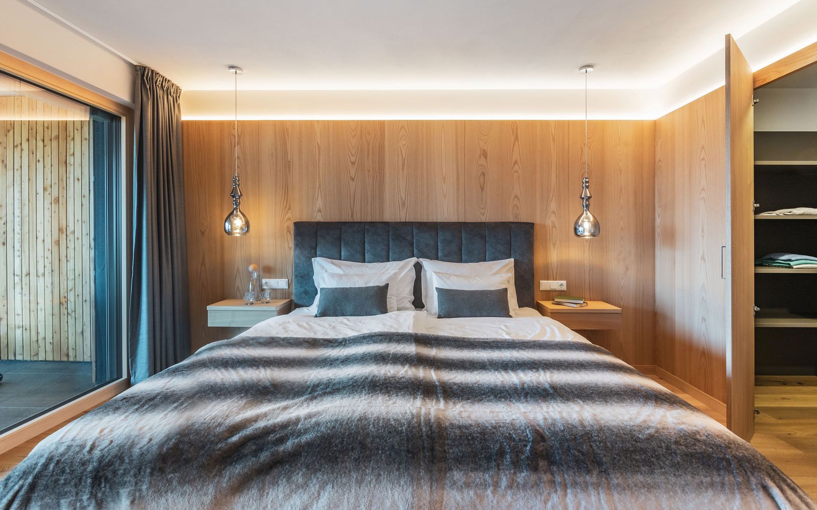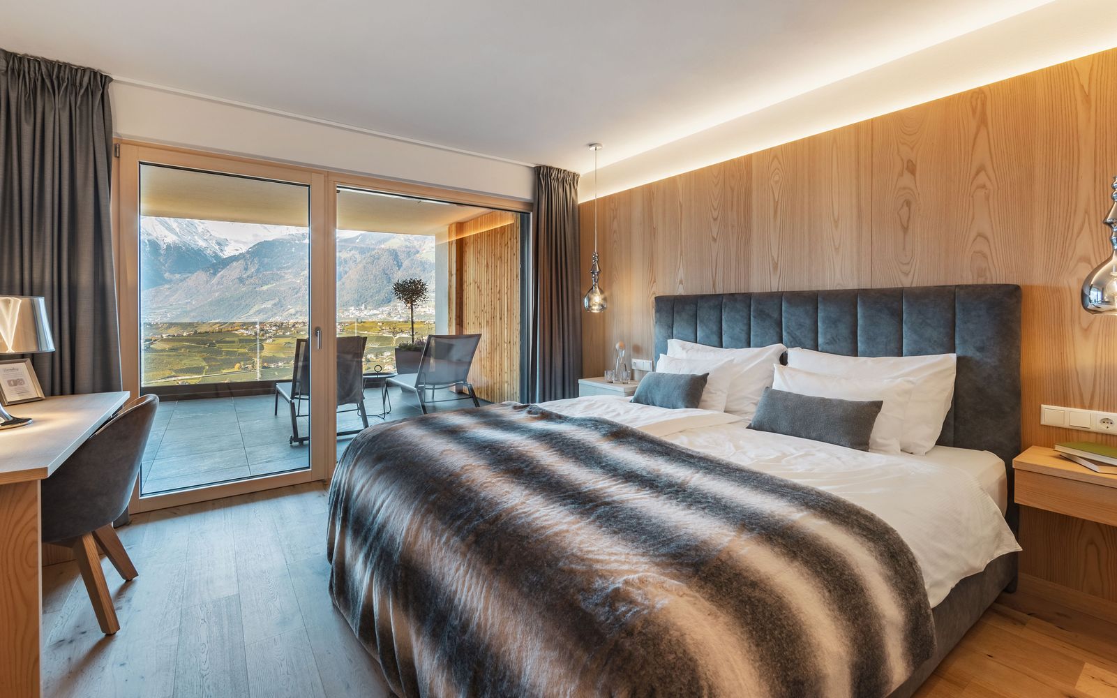 Schlafzimmer mit Kingsize-Bett, Sekretär und Talblick