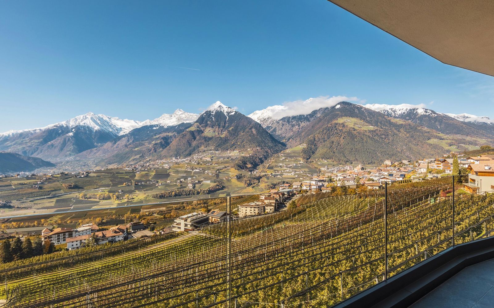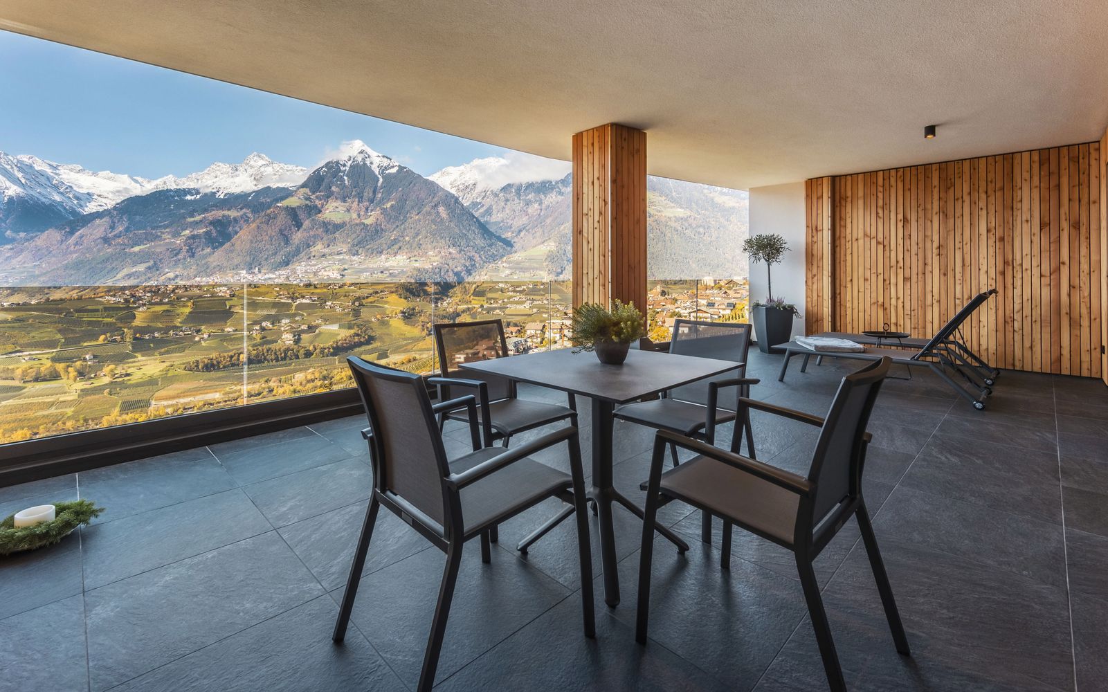 35 m² Panoramaglasbalkon mit Talblick, Tisch mit 4 Stühlen, 2 Liegen und Hollywoodschaukel