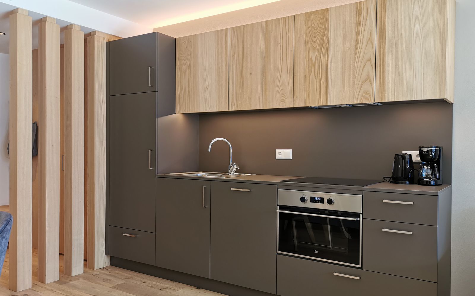 voll ausgestattete Küche mit Spülmaschine, Kühlschrank mit Gefrierfach, Backofen, Toaster, Filterkaffeemaschine, Espressokocher, Wasserkocher und Ess- und Kochgeschirr