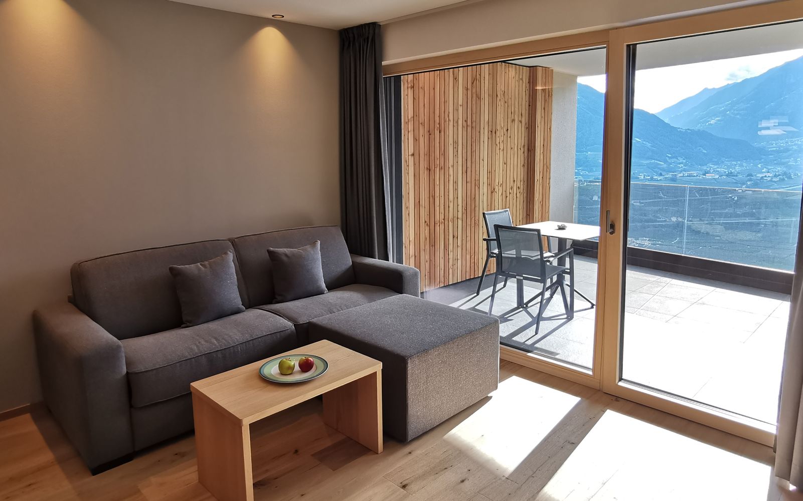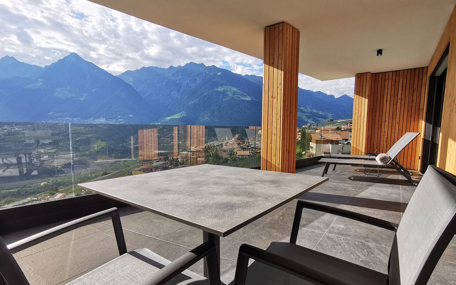 25 m² Panoramaglasbalkon mit Talblick, Tisch mit 4 Stühlen, 2 Liegen