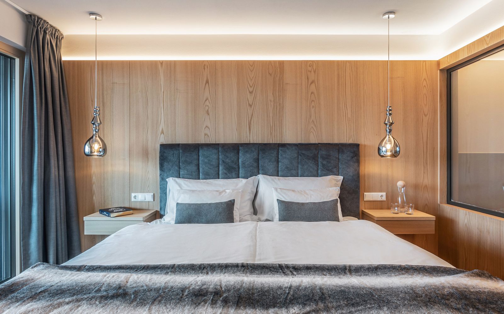 Schlafzimmer mit Kingsize-Bett, Sekretär und Talblick