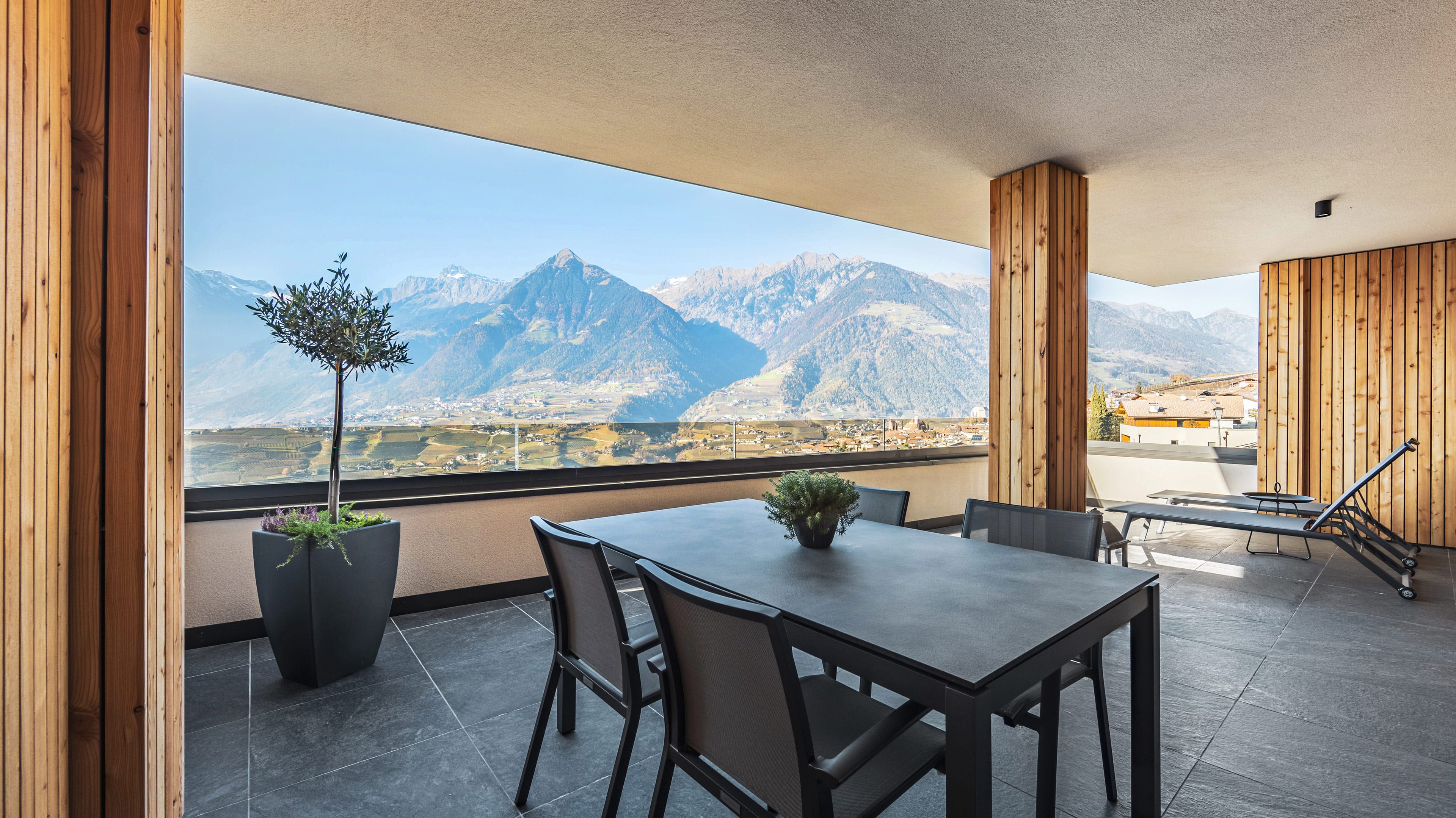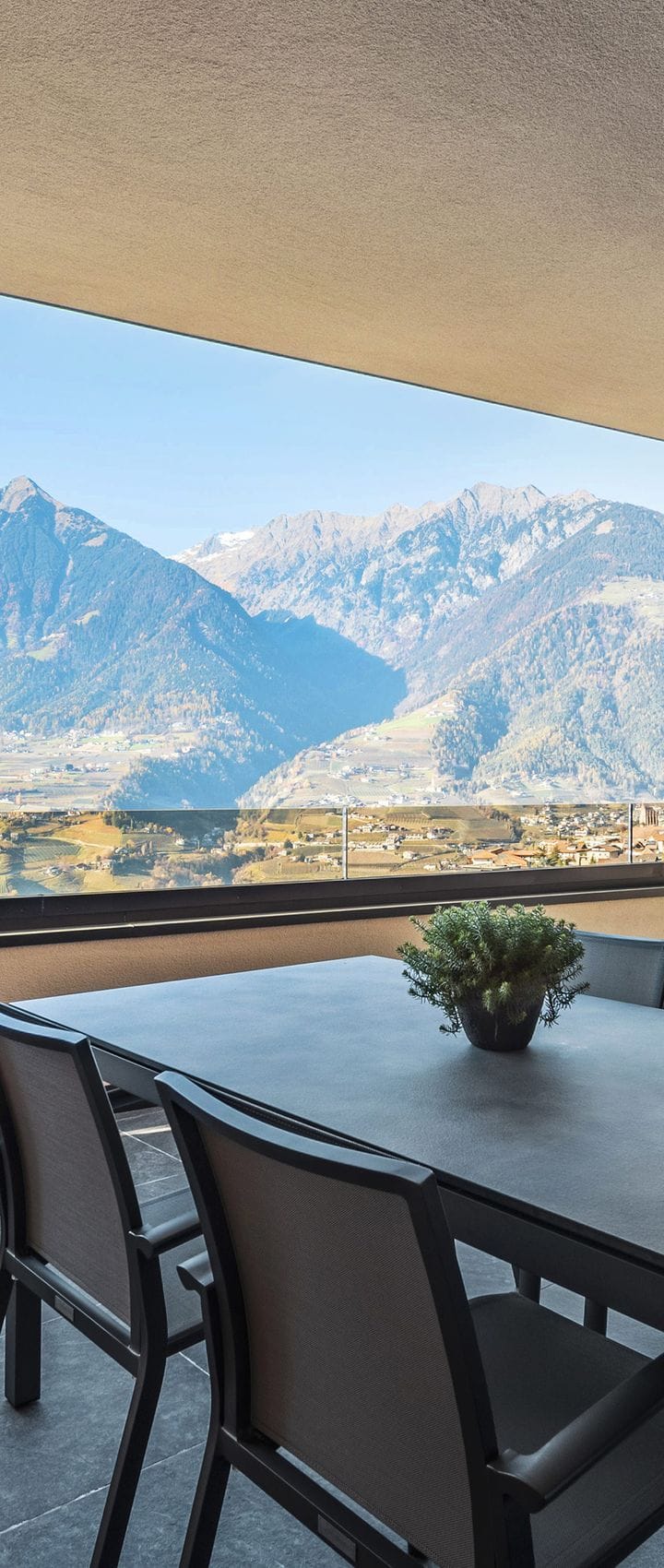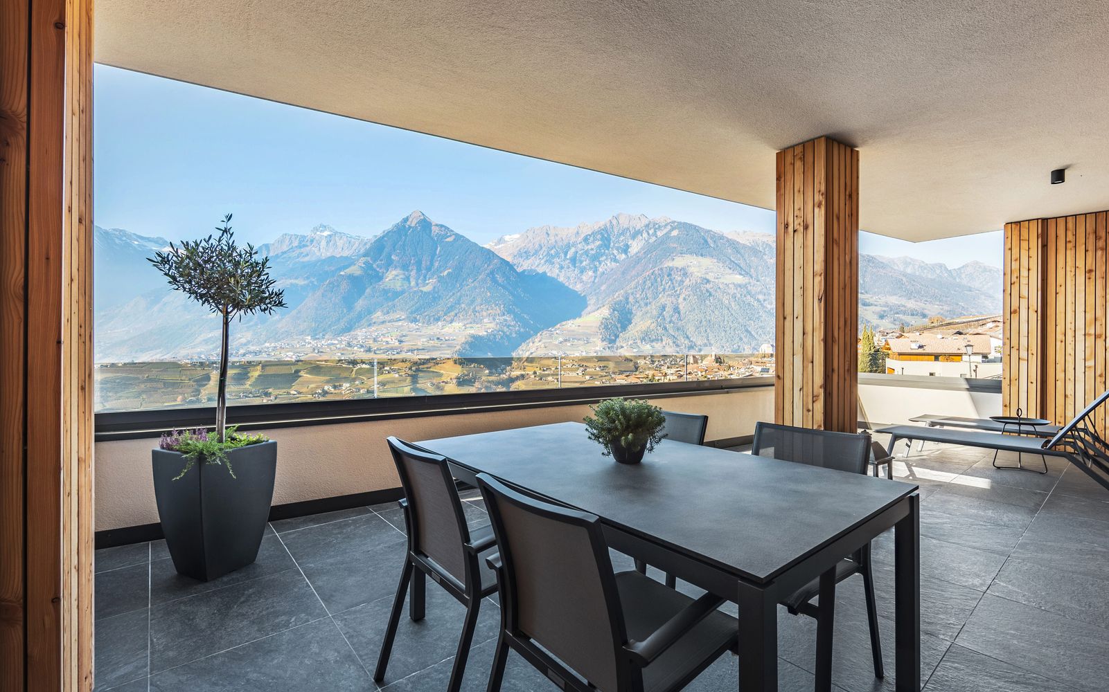 30 m² panoramic glass-panelled balcony overlooking the valley, table with 4 chairs, 2 loungers