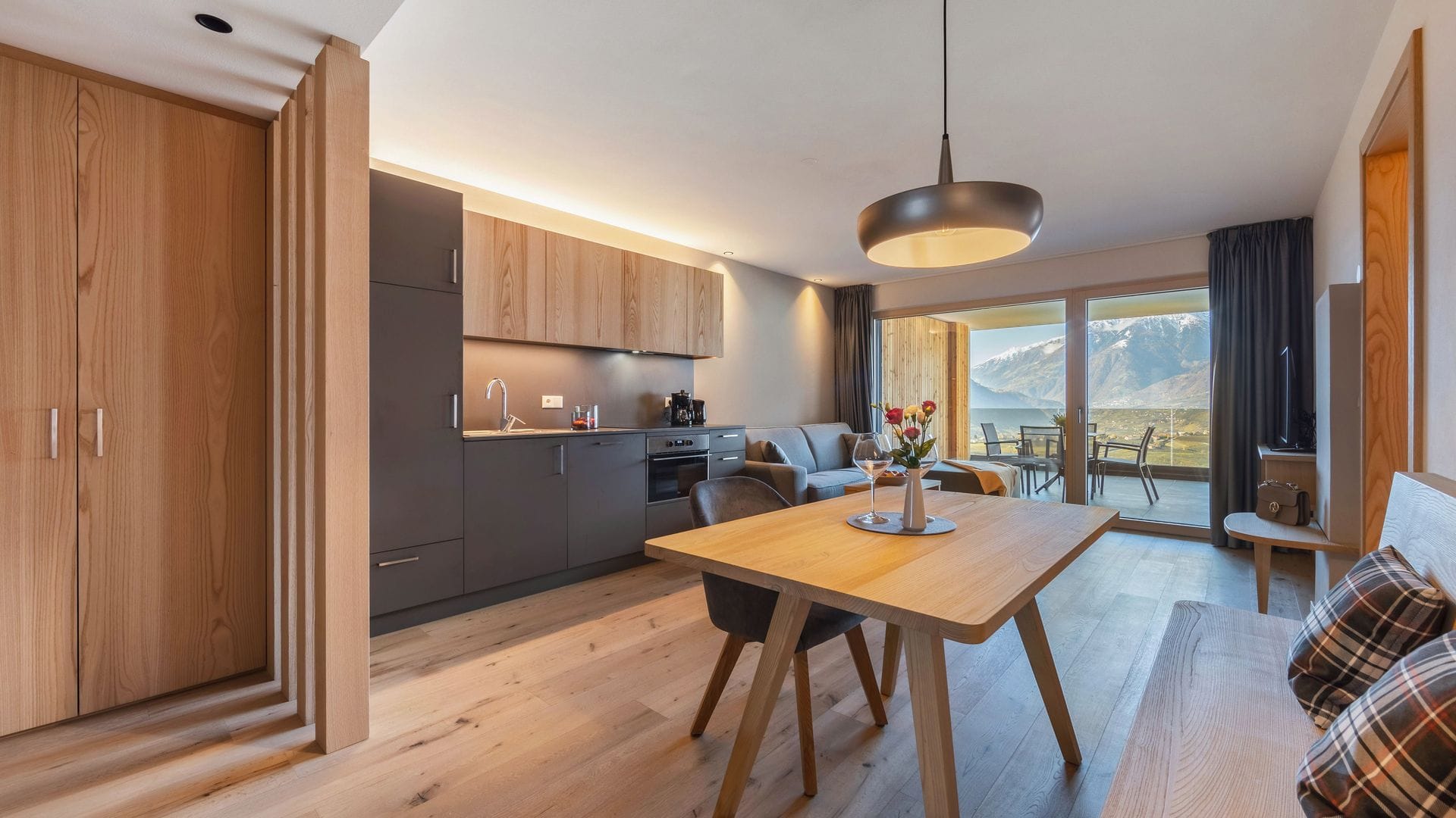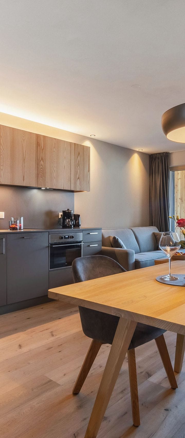 Appena varcato l’ingresso, arredato con gusto, vi troverete di fronte al nostro paesaggio montano, che vi distrarrà immediatamente dalle preoccupazioni e dai pensieri. Inoltre, qui sperimenterete un enorme comfort unito a un’eleganza familiare. Lasciate andare le preoccupazioni durante una cena con il vostro partner sul nostro balcone di 35 m², vi godrete solo il sole della sera e il bel tempo assieme.
