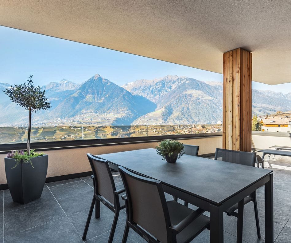 Balcone panoramico in vetro di 35 m² con vista sulla valle, tavolo con 4 sedie, 2 lettini e un dondolo